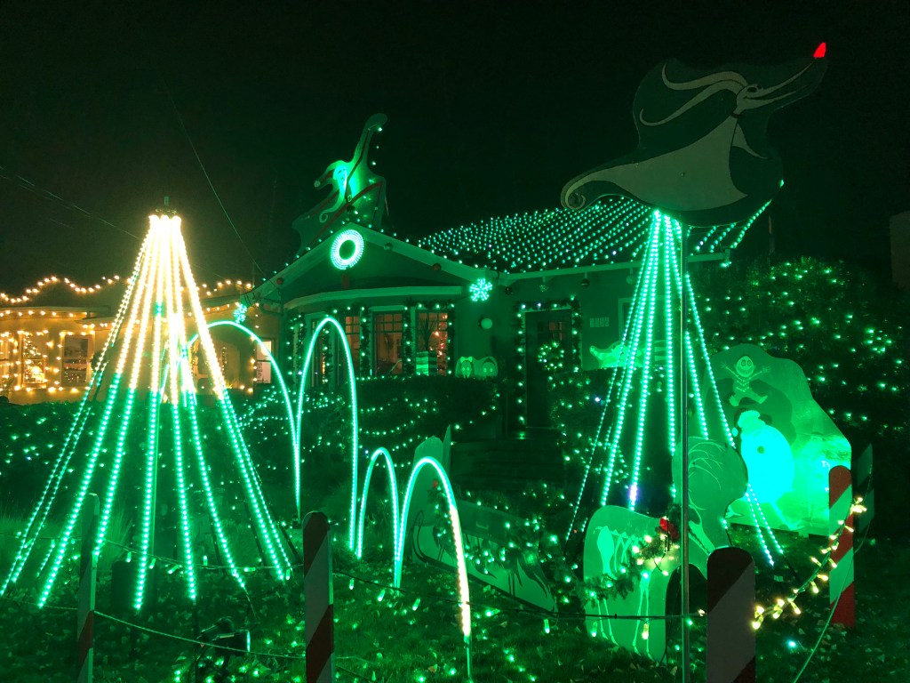 The early winter sunsets make it easy to enjoy an evening stroll at any time. Standout displays include a “Nightmare Before Christmas” house with synchronized lights and music, and a Charlie Brown-themed setup featuring beloved characters from the Peanuts comics.
